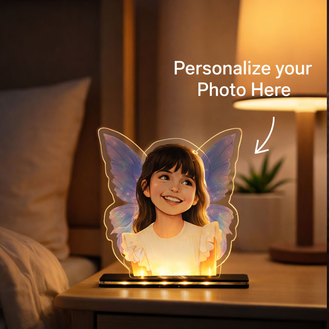 The Fairy Glow – Personalized Kids Cartoon Acrylic LED Lamp transforms your child’s image into a cute cartoon illustration with fairy wings, glowing softly in warm white light. Designed especially for kids, it creates a calm, safe, and comforting bedtime environment.