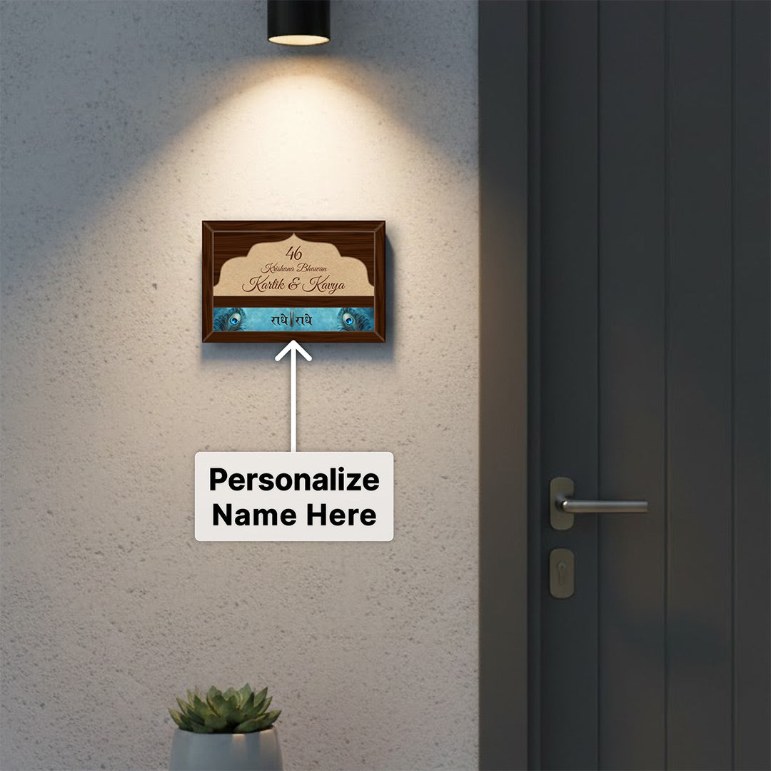 Beautifully crafted with a spiritual Radha Krishna design and premium wooden finish, this name plate adds a graceful and auspicious touch to your entrance.
