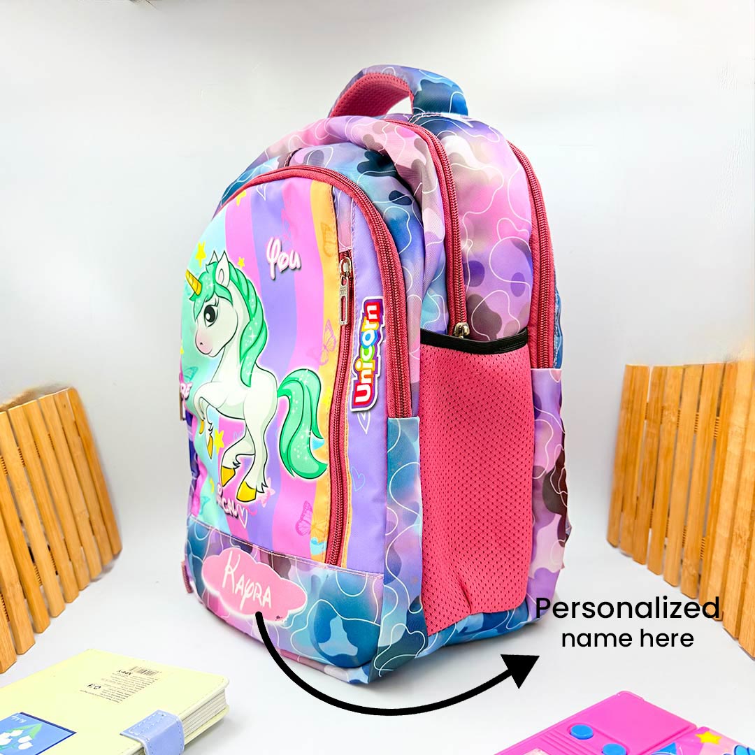Unicorn Personalized School Kids Combo - School Bag| Lunch Box | Water Bottle | Geometry| Pencil Box