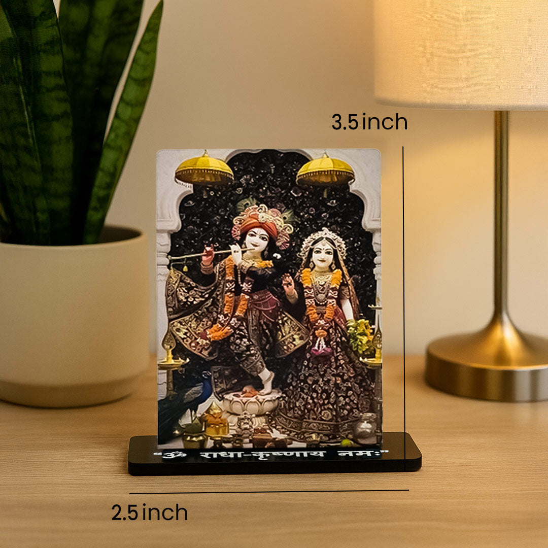 A devotional acrylic dashboard frame of Radha Krishna, ideal for car, desk or home mandir.