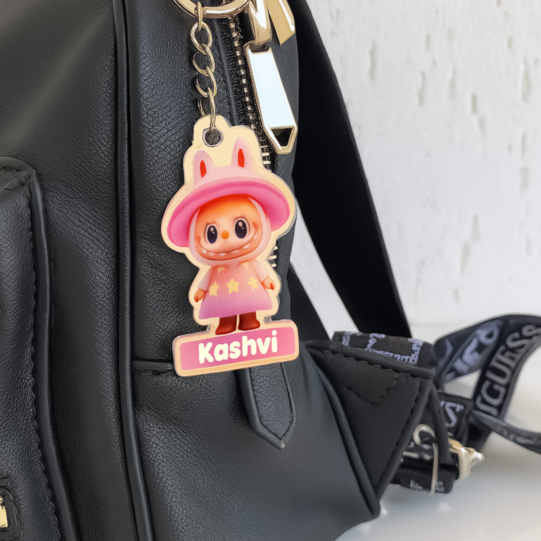 A dreamy bunny-eared character keychain in soft pinks and stars — personalized with your name for that extra magic.