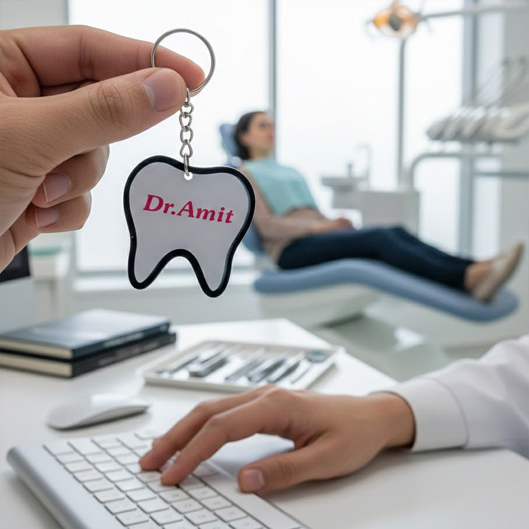 Designed especially for dentists, dental students, and clinics, this compact keychain features a clean tooth design with custom name printing, making it both professional and personal.
