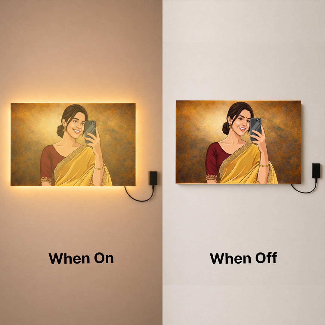 This personalized LED acrylic wall frame is a modern décor piece designed to turn your favorite photo into a stylish cartoon artwork with a beautiful warm white glow. Crafted from premium quality acrylic and printed using advanced UV technology, it ensures sharp detailing and long-lasting color quality. The built-in LED lighting enhances the overall look, making it a perfect addition to bedrooms, living spaces, or personal corners. With its unique customization feature, this frame becomes a meaningful and memorable gift for boys, husbands, and boyfriends.