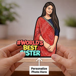 Celebrate your sister with a personalized cartoon cutout stand featuring “World’s Best Sister” design and custom photo artwork