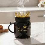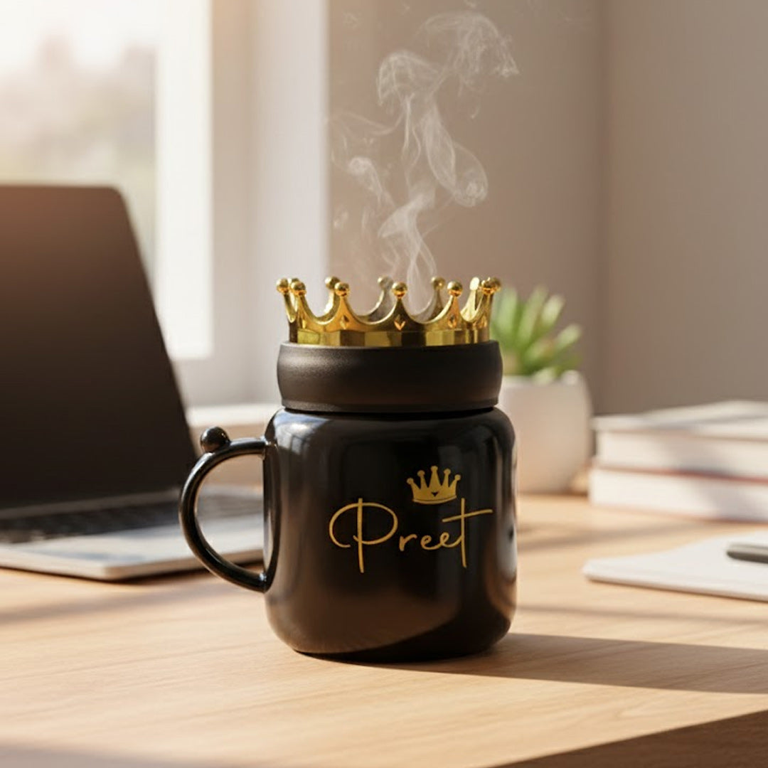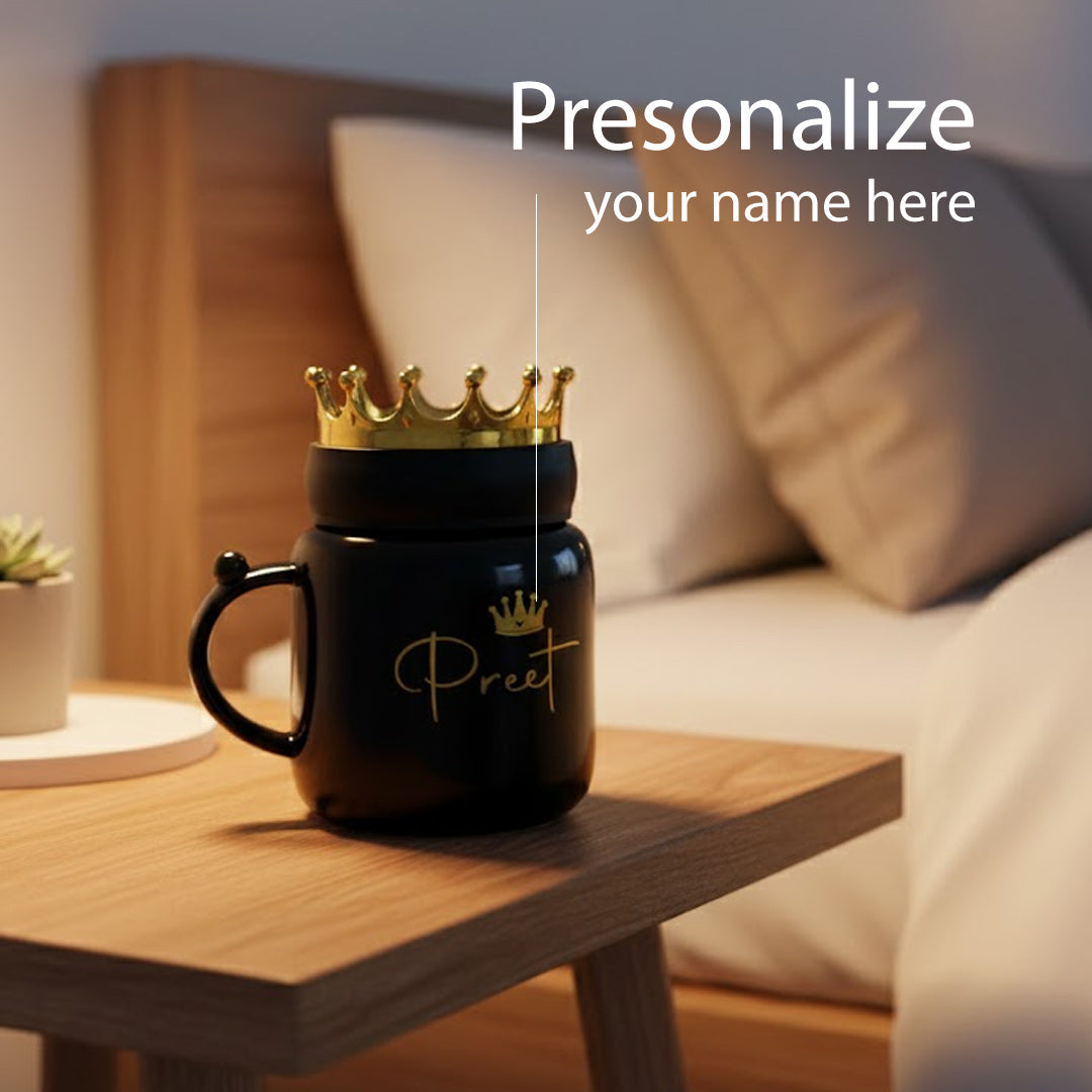 A stylish black ceramic mug with a detachable crown lid and personalized name, designed to make him feel like a King every day.