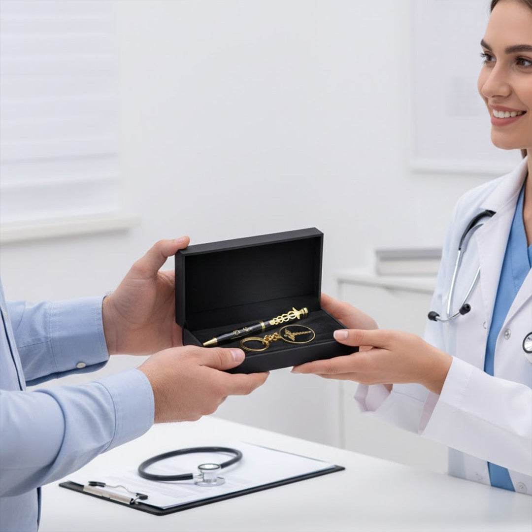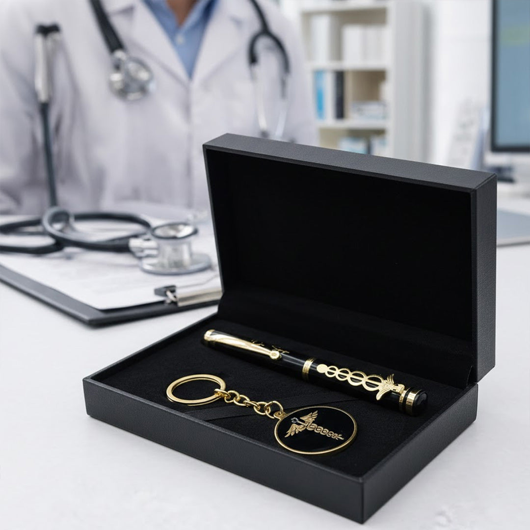 A premium personalized pen and keychain set designed especially for doctors and medical professionals.