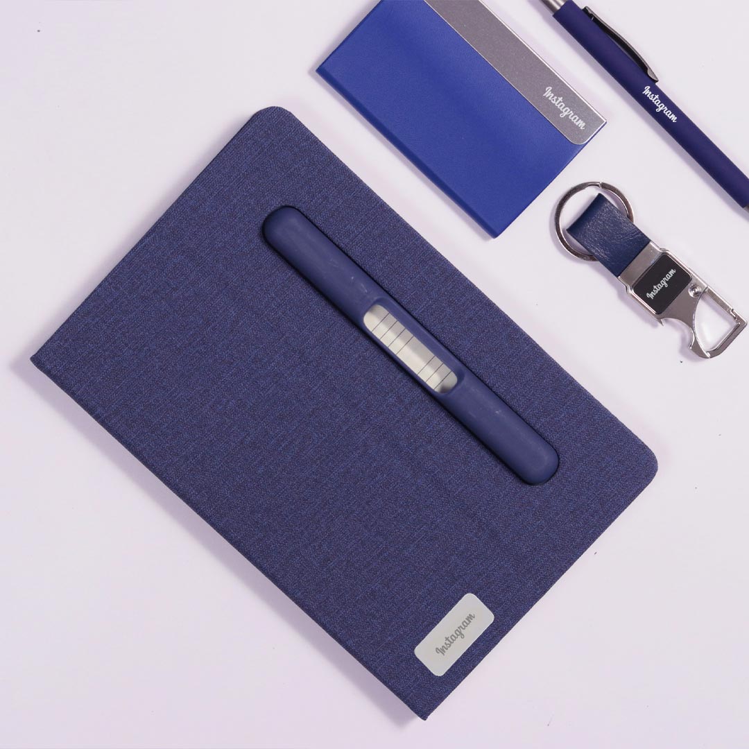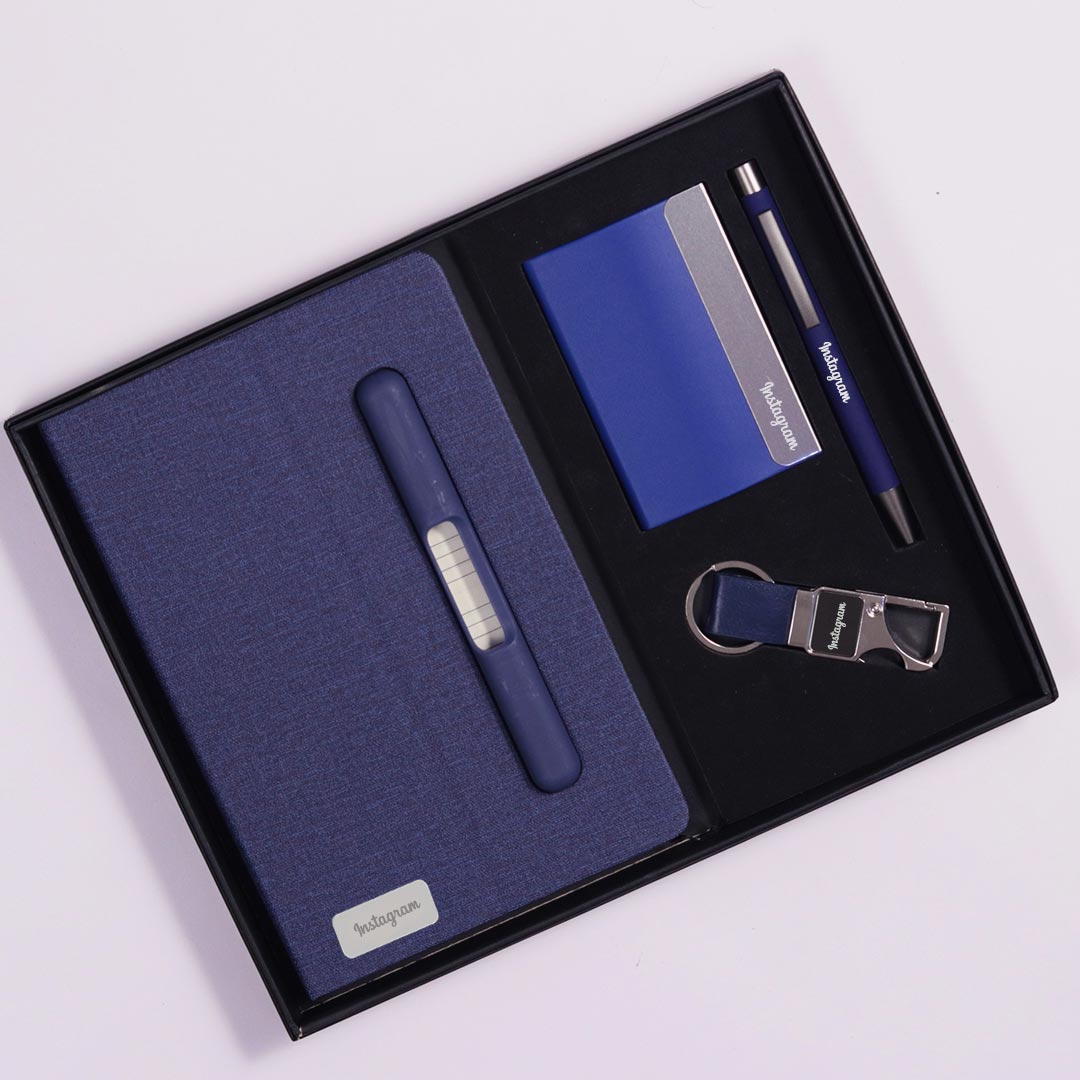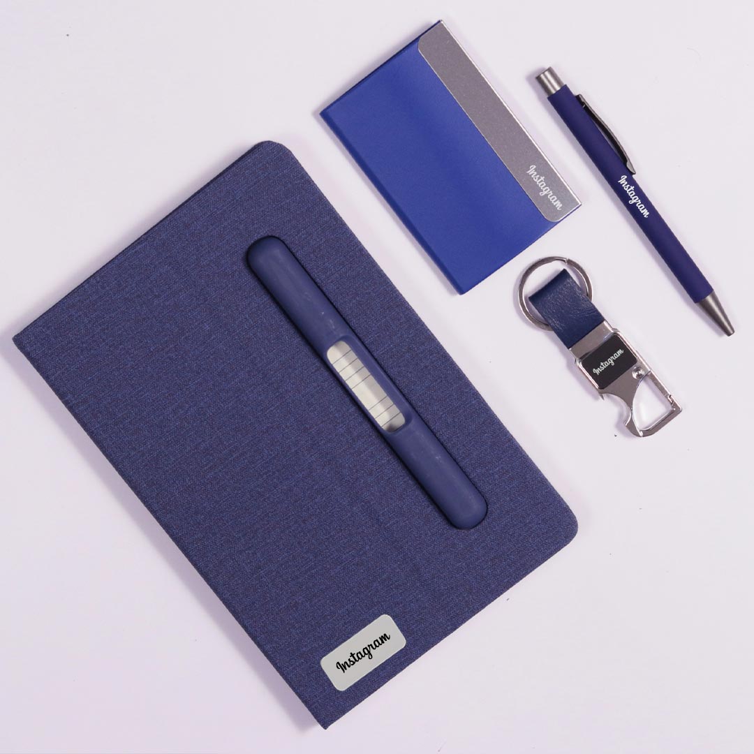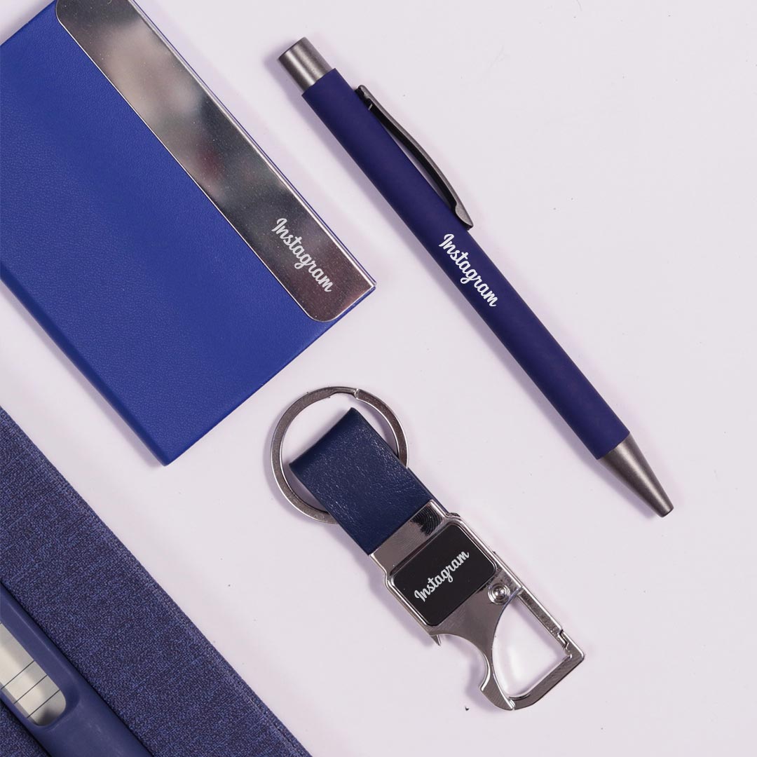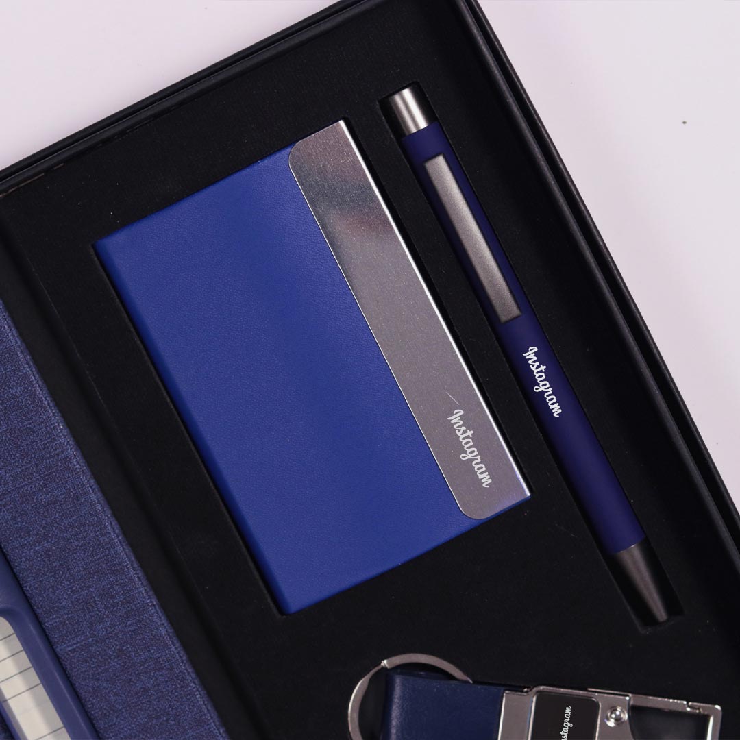- Comprehensive Corporate Gift Set: Includes a premium blue diary, a sleek pen, an elegant card holder, and a stylish keychain.