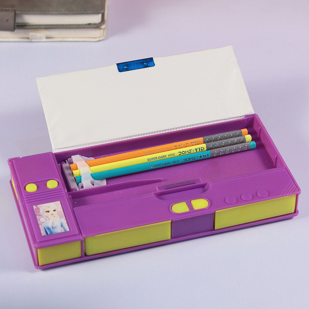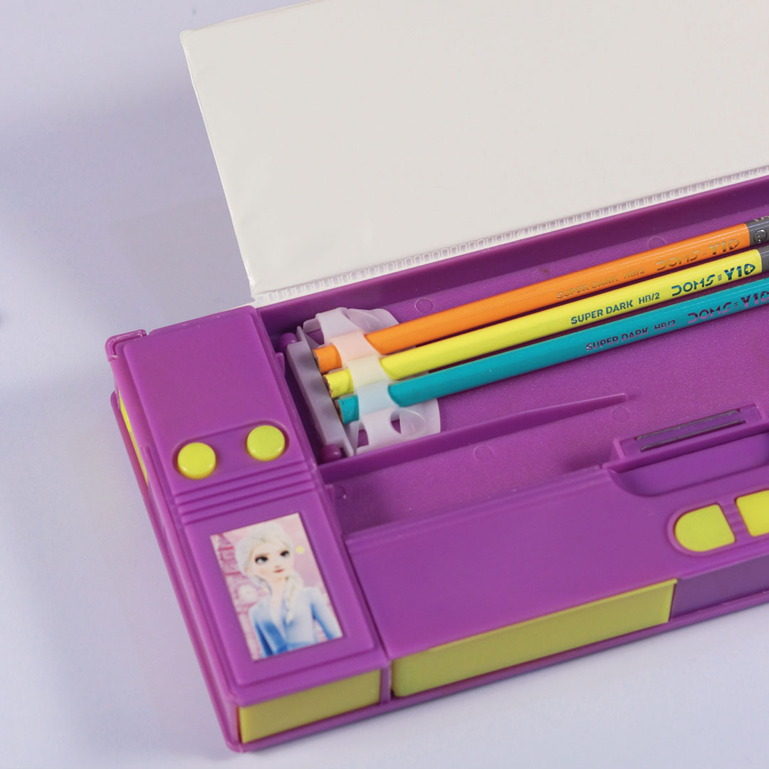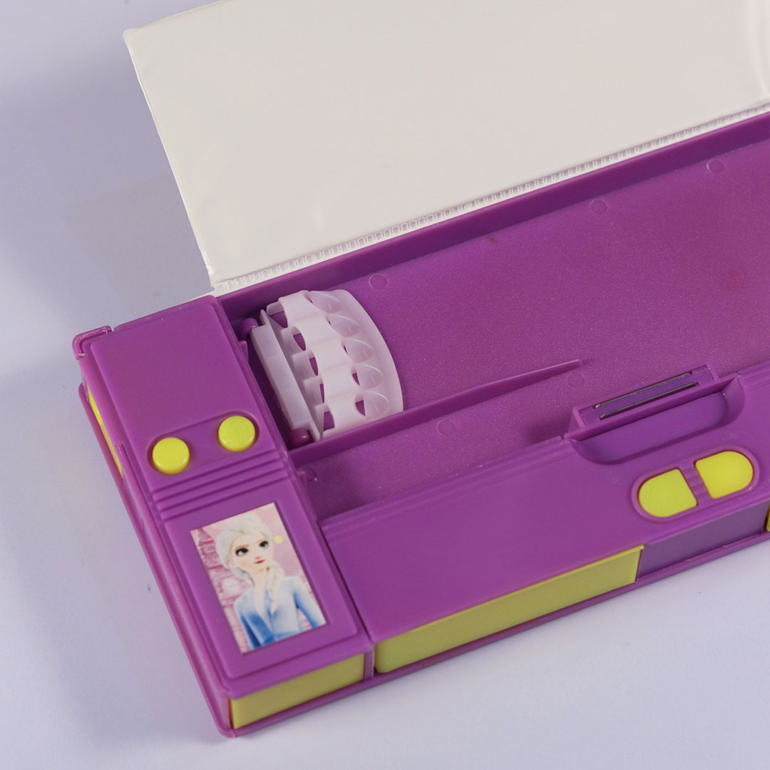 The pencil box sports a striking purple and yellow theme, designed to appeal to young girls. The colors are vibrant yet soothing, perfect for creating a cheerful and inspiring school environment.