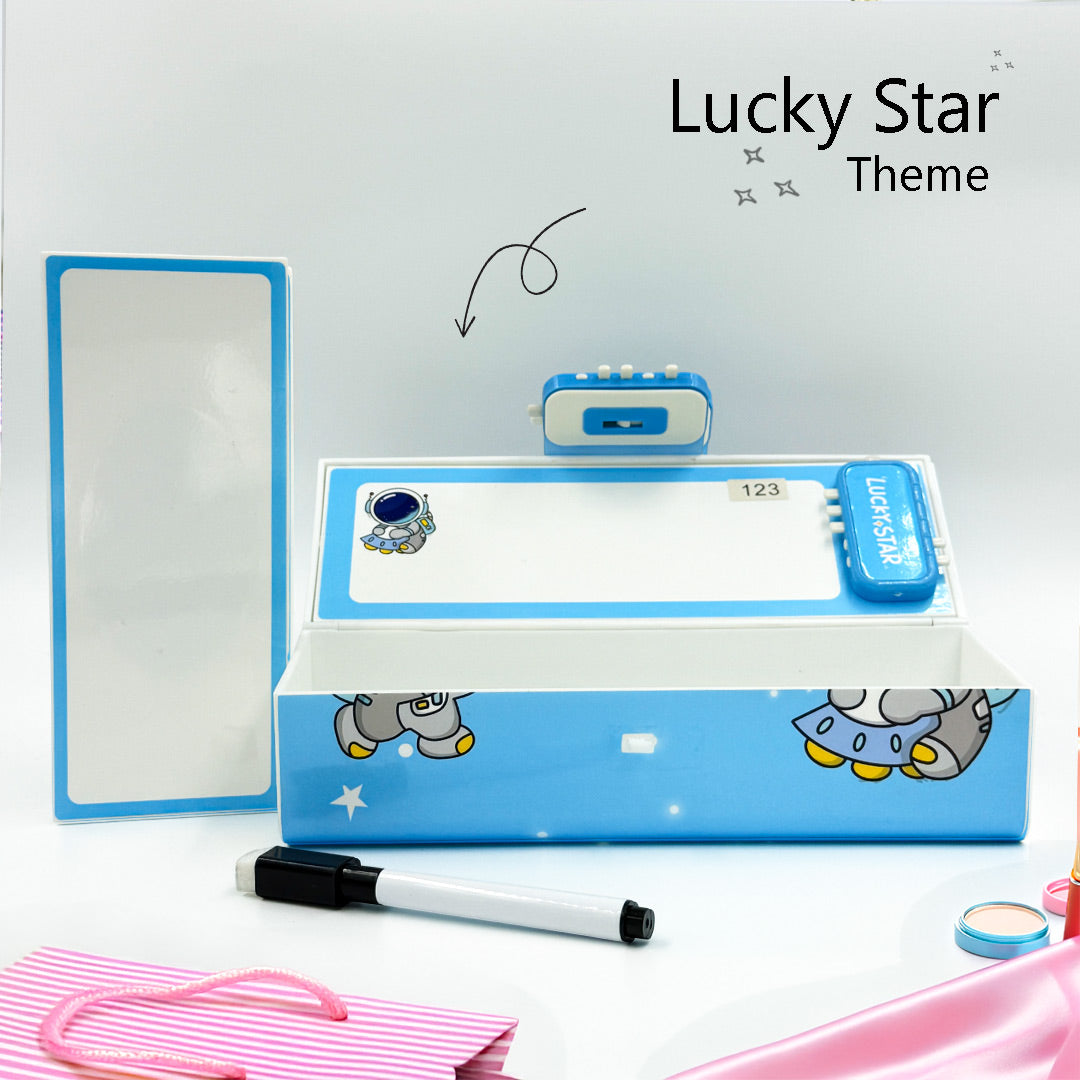The personalized pencil case with password protection is designed with a child-friendly plastic suitcase style featuring: