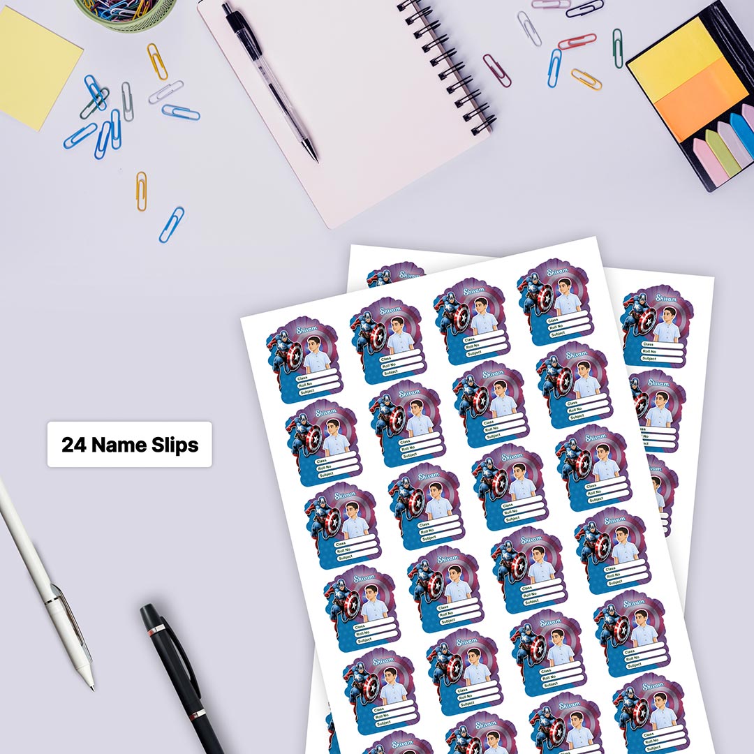 Each sheet includes 24 personalized name slip stickers customized with your child’s name, illustrated AI photo, class, roll number, and subject. The superhero background with Captain America shield graphics makes the stickers visually attractive and perfect for young superhero fans.