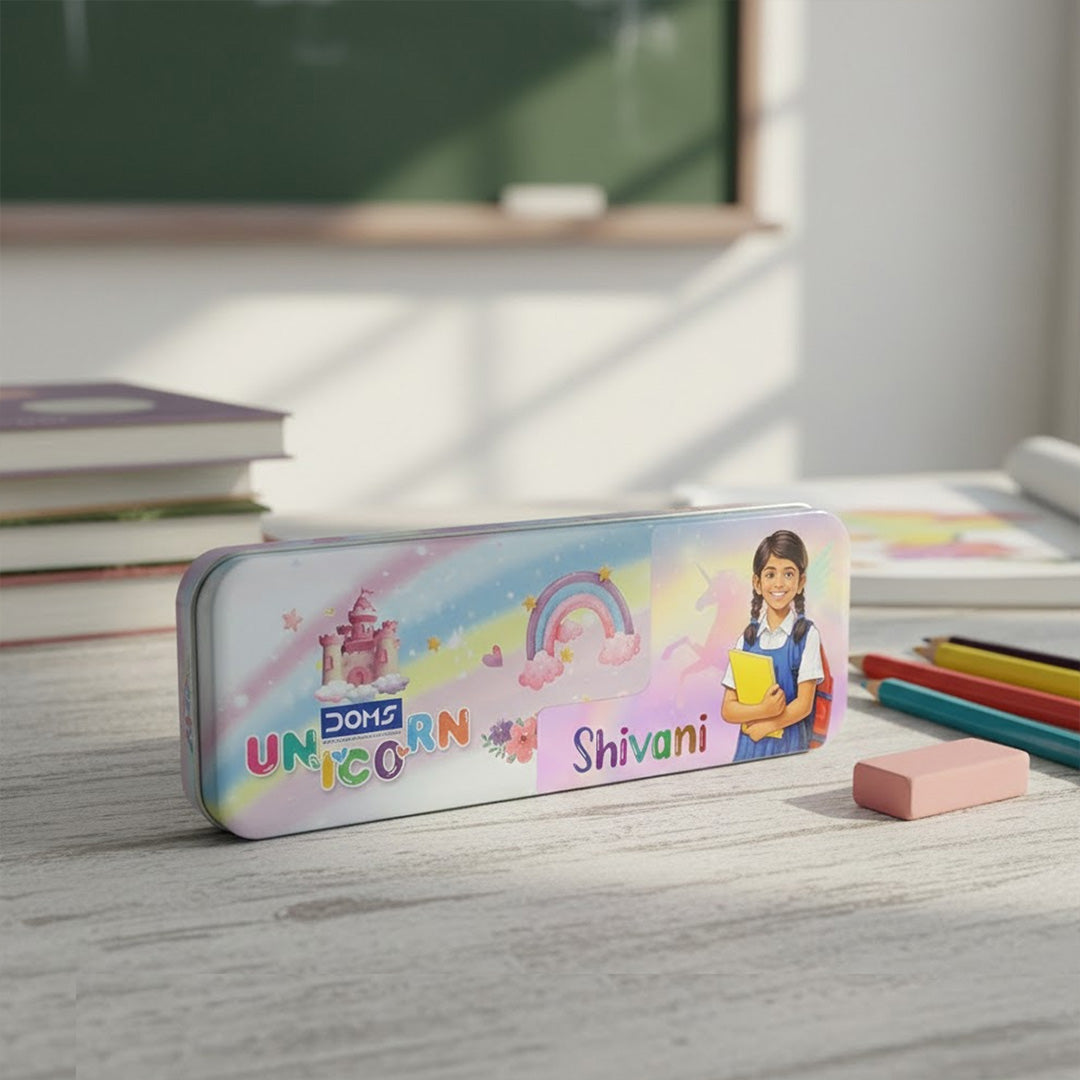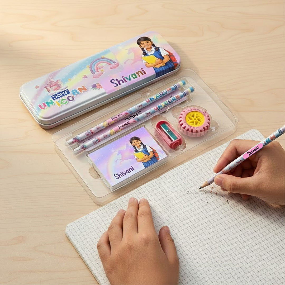 This cute unicorn-themed kids stationery set is customized with your child’s name and photo, making it a fun, practical, and memorable everyday school essential. Designed with bright colors and a magical unicorn theme, it’s perfect for young students.
